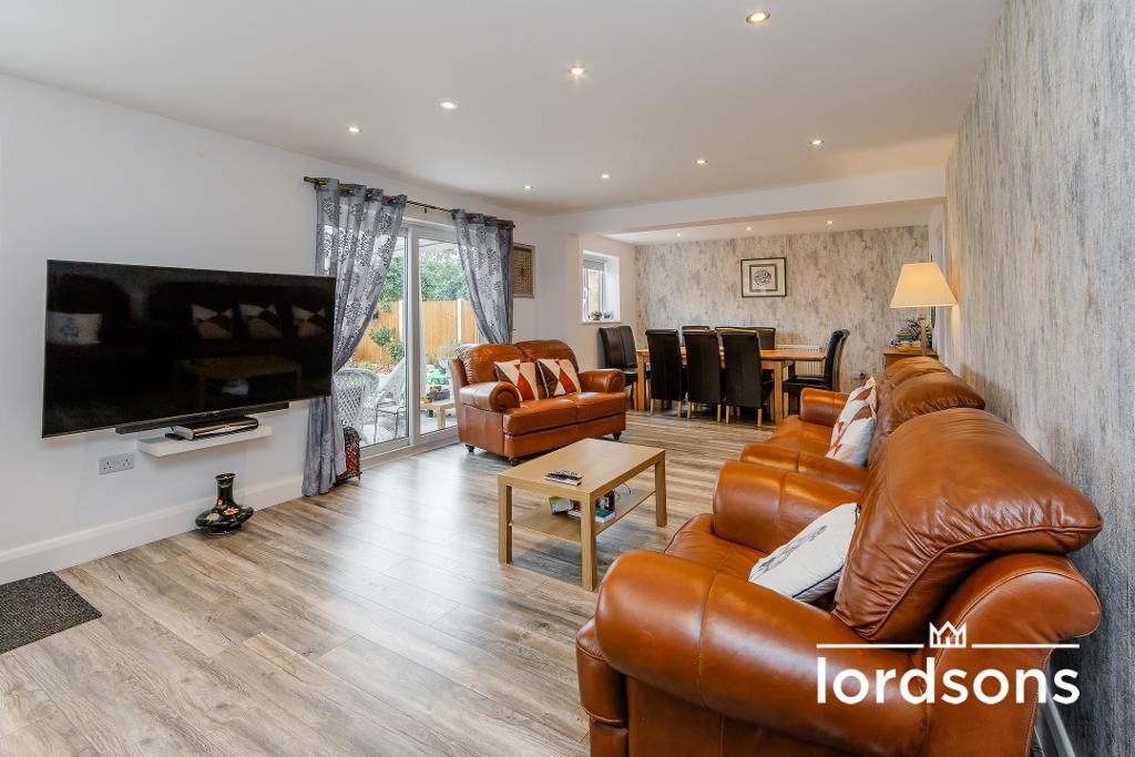 The accommodation begins with a bright entrance hall leading to an open-plan kitchen, lounge, and dining area measuring approximately 11.26m x 3.87m (36'11" x 12'8"). This is a large, functional space that works well for everyday living and entertaining. The kitchen is fitted with modern units, integrated appliances, and a breakfast bar. The lounge and dining areas are open and adaptable, with French sliding doors providing direct access to the rear garden.