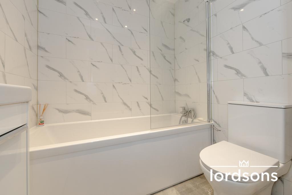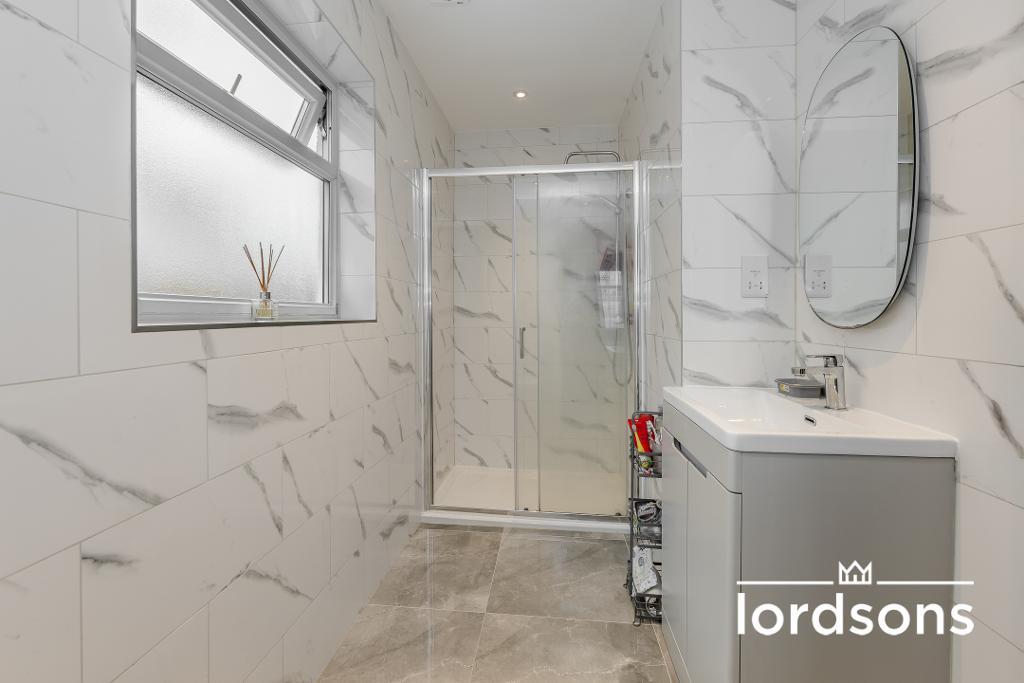 There are three generous double bedrooms. The main bedroom (4.58m x 4.24m) includes fitted wardrobes and an en-suite shower room (1.54m x 3.24m) with a walk-in shower and modern fittings. The second bedroom (4.08m x 3.28m) offers good proportions and flexibility. The third bedroom is also a comfortable double, suitable for use as a guest room, study, or nursery.